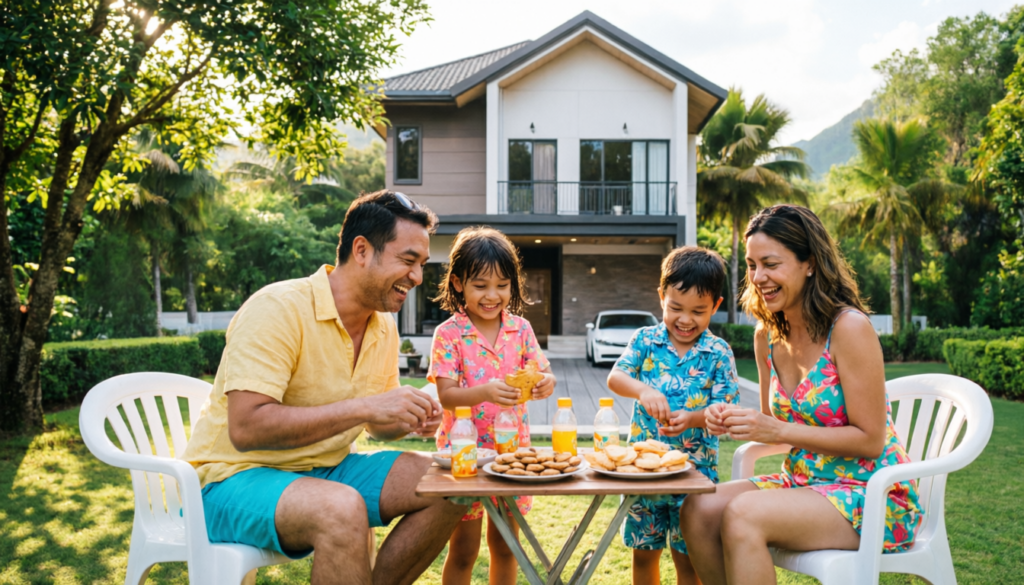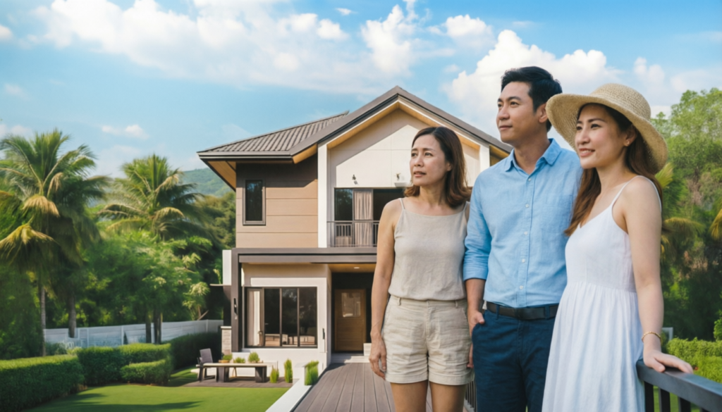 – บ้าน 2 ชั้น มีโครงสร้างทรงจั่วสูง ด้านบนเป็นหลังคาทรงจั่วสีเทาเข้ม